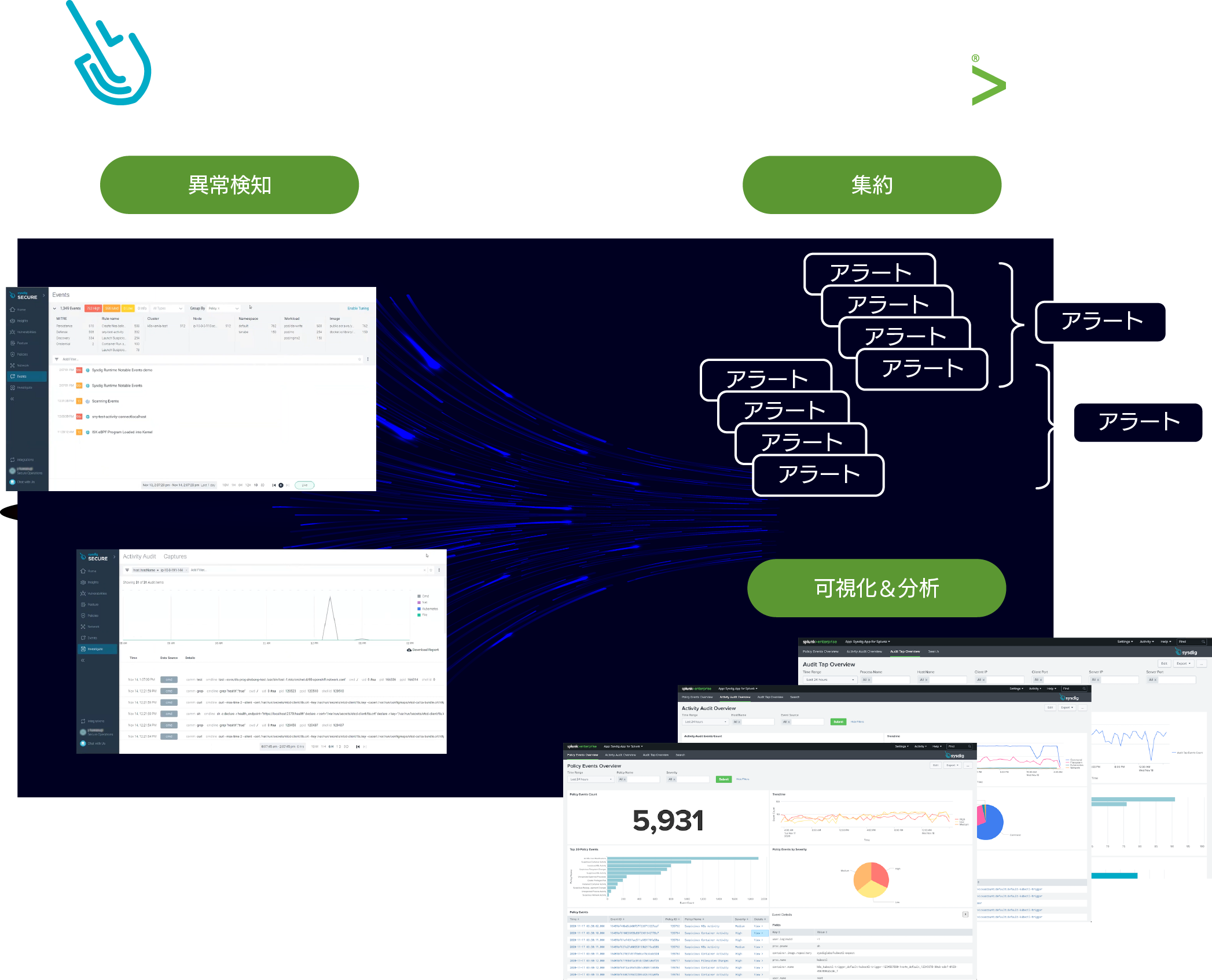 Sysdigで検知されるインシデントをSplunkが分析、集約することで、本来対応すべきインシデントを正しく抽出でき、無駄なインシデント対応コストを削減できます。